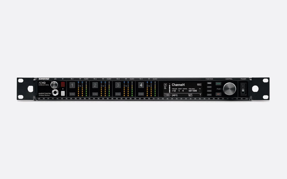 AD4Q Receiver - FixedThe AD4Q receiver has the same functionality as the AD4D receiver but offers four reception channels. The receiver can be linked to two antenna for normal operation, or four antenna for 'Quadversity' mode, in which four remote antenna can be connected for optimum reception and much reduced drop out. This is particularly useful for operation within stadia or theatres where line-of-sight reception is not applicable, but also effective for multi-room broadcast operating from a central control hub such as in hotel presentation rooms or houses of worship. When running in 'Quadversity' mode, the BNC connectors usually used for cascading are used instead for the two additional remote antenna.