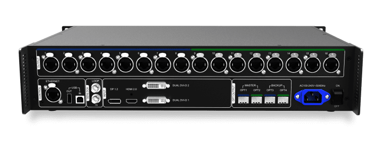 Supports 16-channel Neutrik Gigabit Ethernet outputs and 4-channel optical fiber outputs and maximum loading capacity of a single unit up to 3840x2160@60Hz;